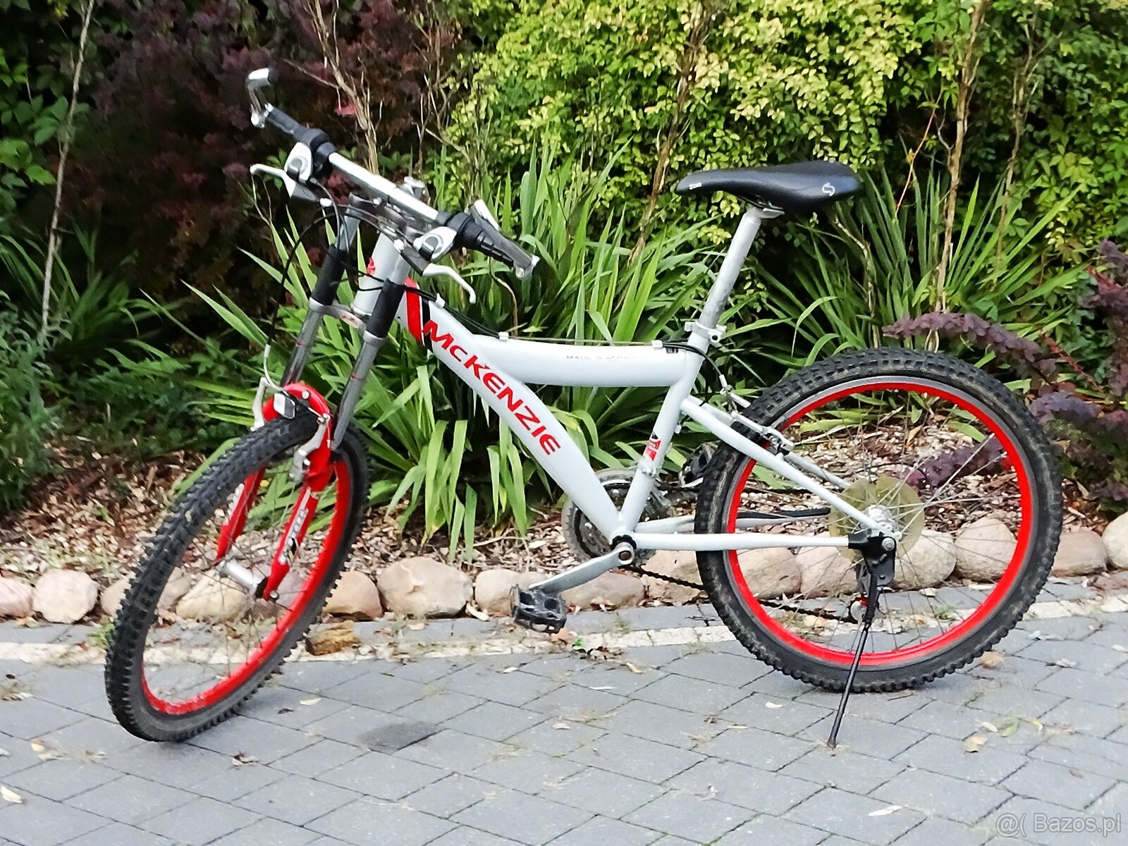 Rower górski marki MCKENZIE, z charakterystyczną srebrno-czerwoną ramą, czerwonymi obręczami i oponami terenowymi. To typowy MTB (Mountain Bike), zaprojektowany do jazdy po nierównym terenie, lasach, drogach szutrowych i miejskich przeszkodach. Oto pełne zestawienie: